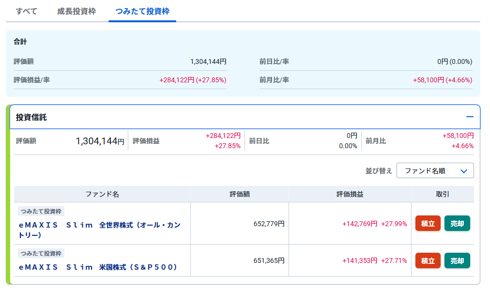 と銘打ちまして、オルカンとS&P500を同額つみたてしています。